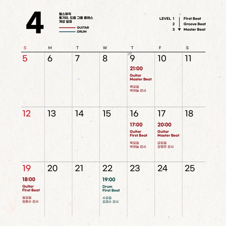 26년 4월 [통기타 & 드럼 그룹레슨] 개강 일정