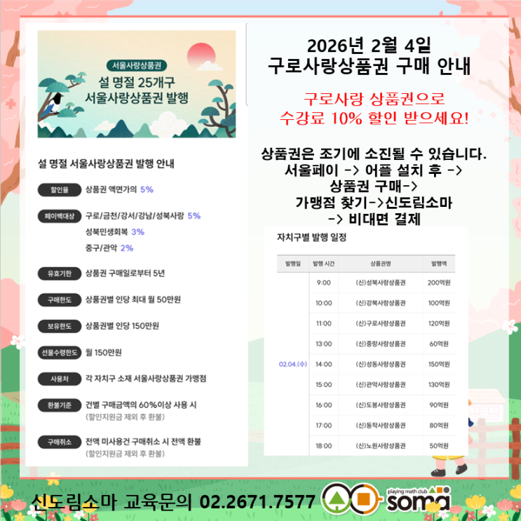 안녕하세요. 신도림 소마학원입니다. 구로사랑상품권을 이용하시면 수강료를 10% 할인된 금액으로 결제하실 수 있습니다. (소마학원은 서울페이 결제 가맹점입니다.) 구로사랑상품권은 2월 4일(화) 오전 11시부터 서울페이 앱에서 구매 가능하며, 상품권은 조기 소진될 수 있으니 참고 부탁드립니다. [서울페이 이용 방법 안내] ① 서울페이 앱 설치 ② 구로사랑상품권 구매 ③ 가맹점 찾기 → ‘신도림 소마’ 검색 ④ 비대면 결제로 결제 ****결제 후 메모란에 학생 이름 남겨주세요**** 신도림 초등 전문 수학학원 "결과로 증명하는 신도림 소마 카카오 채널" -> https://pf.kakao.com/_xfxdXpxj 초등 전문 신도림소마 수학학원....... <img src="https://blogthumb.pstatic.net/MjAyNjAxMjhfNjcg/MDAxNzY5NTkyODY1NTY1.VgY_2T8POvqsYZGkojSBx9ZqJ5GQNEu43xMvGnXs15Ag.FkQQKgaEaVIfEu_Jstx9WAf6abad4wJ4_Z4v-cU_J_Ig.PNG/image.png?type=s3" />