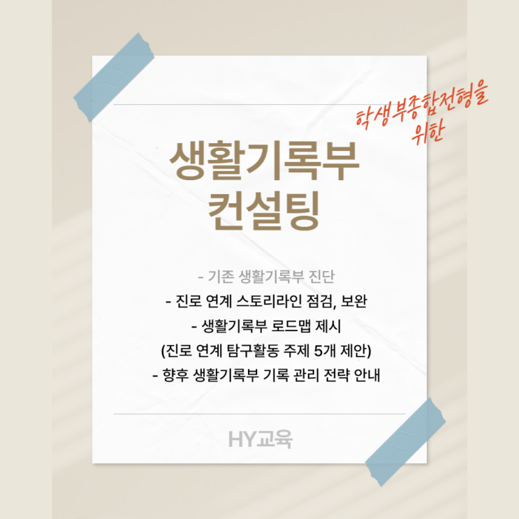 2028 대입 개편과 5등급제 도입으로, 내신 등급만으로 학생을 변별하던 구조는 점점 약화되고 있습니다. 이에 따라 학생의 학업 태도, 탐구 과정, 전공 관심도, 학교 활동 전반이 담기는 생활기록부의 중요성은 오히려 더 커지고 있습니다. 특히 학생부종합전형에서는 ‘무엇을 했는가’보다 ‘어떤 흐름으로 성장했는가’, ‘전공과 어떤 방식으로 연결되어 있는가’가 더 중요하게 평가됩니다. 하지만 많은 학생들이 - 세특에 무엇을 어떻게 남겨야 하는지 - 활동을 진로와 어떻게 연결해야 하는지 - 지금 하는 선택이 입시에 어떤 영향을 주는지 정확히 알지 못한 채 학교생활을 이어가고 있는 것이 현실입니다. 생활기록부는 단기간에 완성할....... <img src="https://blogthumb.pstatic.net/MjAyNjAxMjlfMjEx/MDAxNzY5NjczNTU1NTYw.cTJGSNne8jBZp4g5TijZsMxiPmj6W9ZPR_vx4dEoQk8g.necl_92vrKGKWKPKveylZByFdSrX5AzizYCfHuajV48g.PNG/%C1%A6%B8%F1%C0%BB_%C0%D4%B7%C2%C7%D8%C1%D6%BC%BC%BF%E4_-003_%281%29.png?type=s3" />
