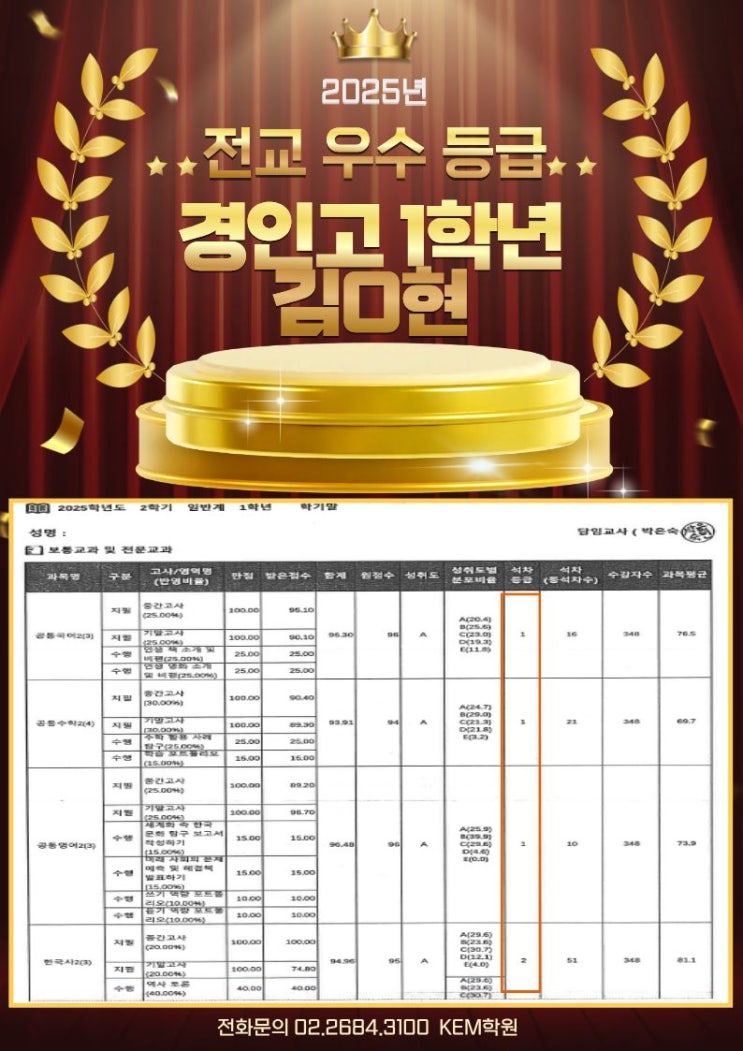다음은 2024년 2학기 KEM과 함께 최선을 다해서 좋은 성적을 얻은 전교 우수 등급 학생들입니다. 경인고 1학년 김O현 경인고 1학년 박O빈 경인고 2학년 손O표 경인고 2학년 윤O미 경인고 2학년 최O우 축하합니다~! KEM학원은 꼼꼼한 내신 관리 + 완벽한 모의고사 대비 & 자세한 대입 상담을 통해 원하는 대학까지 함께합니다. 자세한 문의와 상담은 학원으로 전화주시거나, 편하신 시간에 학원으로 방문해주시면 더욱 상세한 상담이 가능합니다. 전화 상담 : 02- 2684-3100 <img src="https://blogthumb.pstatic.net/MjAyNjAxMjlfMjM1/MDAxNzY5NjgyNzYyNzM1.0khIYcD8flThDGiez58UGJWkva5paZu7eMj_yFeS7gYg.bPGlBAntyBOcMpS1pCIh6newPefS7pImLcMgZn8kIFwg.JPEG/4-%B1%E8%BD%C3%C7%F6.jpg?type=s3" />