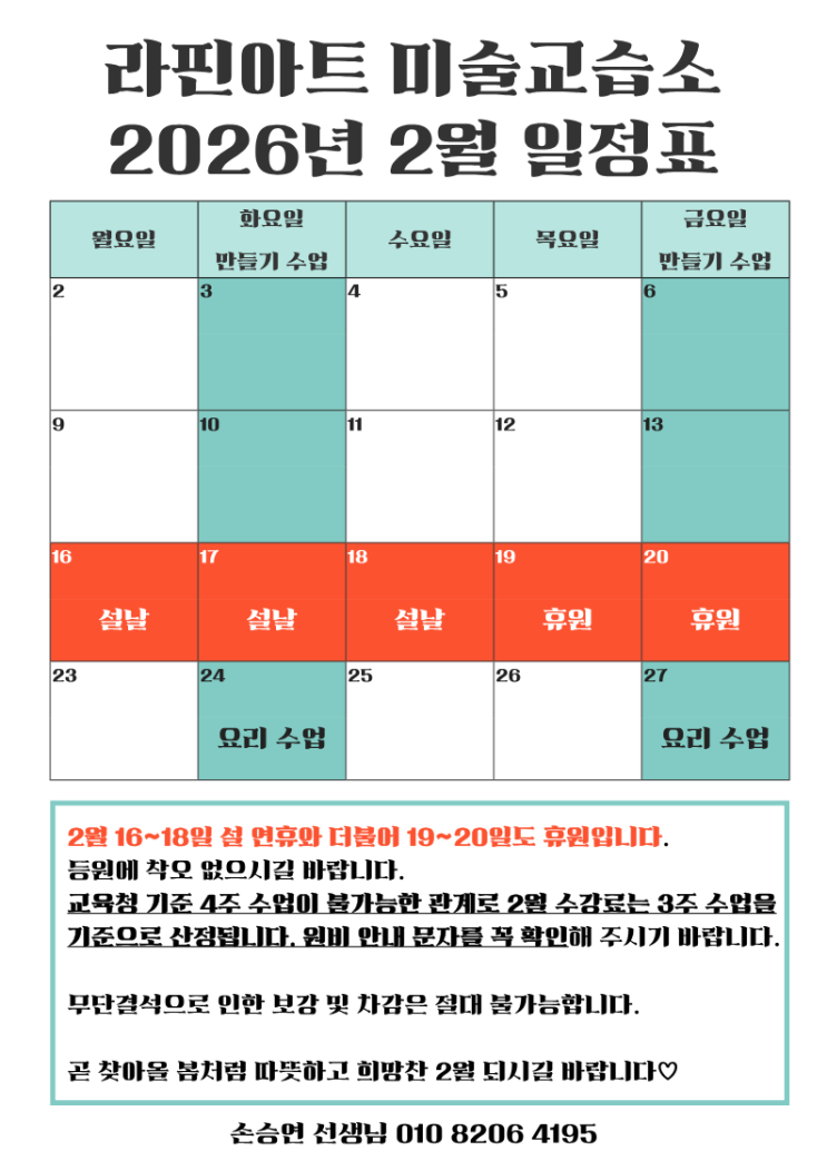 [구로 미술 학원] 구로5동 미술학원, 라핀아트 2026년 1월 일정표