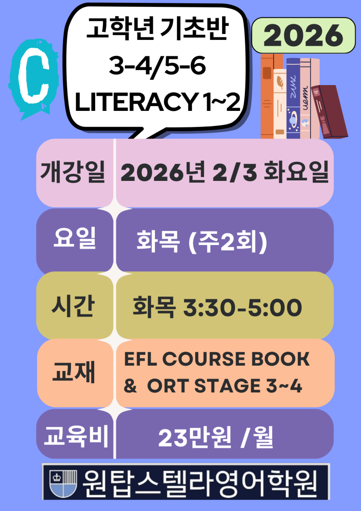 [원탑스텔라영어학원 Literacy Plus 반- 주 2회수업안내] 원탑스텔라영어학원의 2026학년도 고학년 기초반 Literacy Plus 반이 2월 3일(화) 개강합니다. 고학년이지만 영어를 늦게 시작한 아이일수록, 지금은 진도가 아니라 ‘기초를 제대로 다지는 시간’이 필요합니다. 고학년이라고 해서 무작정 앞서갈 필요는 없습니다. 영어를 늦게 시작했다면, 지금은 더 탄탄하게 다져야 할 때입니다. 고학년인데 영어를 늦게 시작한 아이들은 원탑스텔라영어학원에서 속도를 내기보다 기초를 정확히 잡아주는 게 가장 중요합니다. 늦게 시작했을수록, 기초는 더 단단하게 고학년 영어, 속도보다 기초 지금 다진 기초가 중등 영어를 결정합니다. https://b....... <img src="https://blogthumb.pstatic.net/MjAyNjAxMDVfMjMx/MDAxNzY3NTU0MTY3NDQ4.fMpqsH_3ce_R1bSnVueS1m3WvTxOp-dufrNhccFbmHQg.H_0-4MpnURSVKcxSRHvXTEDyHq8QgKm6rSxkhjk7Q8wg.PNG/5.png?type=s3" />