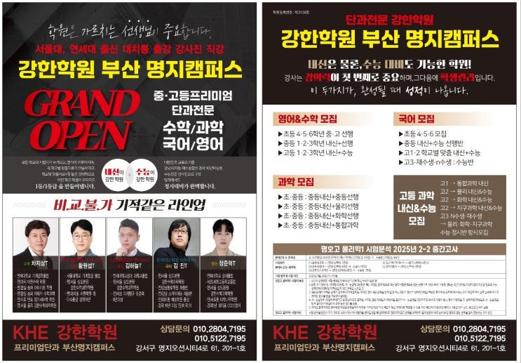 [중등] 강한학원부산명지캠퍼스 전과목 수강료 100만원 이벤트! 안녕하세요, 강한학원 부산명지캠퍼스입니다. 이번에는 많은 학부모님과 학생분들께서 관심 가져주고 계신 강한학원부산명지캠퍼스 [중등] 전과목 수강료 100만원 이벤트와 함께, 현재 모집 중인 과목과 강사진, 수업 방향을 한 번에 정리해 안내드리려고 합니다. 학원 선택에서 가장 중요한 기준 학원을 선택하실 때 시설이나 거리도 물론 중요하지만, 결국 가장 큰 차이를 만드는 건 가르치는 선생님이라고 생각합니다. 강한학원 부산명지캠퍼스는 이 점을 가장 우선에 두고 국어, 수학, 영어, 과탐 전 과목을 실력과 경력을 검증받은 강사진으로 구성했습니다. 그래서 이번 강한....... <img src="https://blogthumb.pstatic.net/MjAyNjAxMDdfODQg/MDAxNzY3NzU4MTE2MjMw.dfpghxLxux-pM2O3BQ7MAsuqkYL9GvPBTmhgXPMYf7sg.V48HUR3-hynzeMYQTSN_hAM-MnA4TZBFb01CvEWxJwEg.JPEG/KakaoTalk_20260107_123114659.jpg?type=s3" />