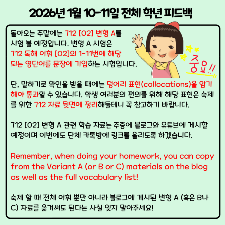 25년도 수고 했습니다. 기말고사 보느라 고생들 많았어요~!! 기말고사가 끝난 만큼 이제 방학을 어떻게 잘 보낼지 생각하는 연말이 되면 좋겠네요. 이번 기말고사 성적도 학교 영어 기말 평균 90을 넘었네요~ 100점을 맞은 친구들과 시험기간 열공하느라 고생했고, 지난 시험보다 조금 못 본 친구들은 너무 상심말고, 내년을 기약합시다. 대학 수시도 마무리 되고 있고, 정시 준비하느라 바쁘더라도 서두르지말고, 고생한 만큼 좋은 결과 있길 바랍니다~ 26학년도 대학에 합격한 모든 수험생 친구들 합격을 진심으로 축하합니다~^^ 2015년 학원을 개원한지 벌써 만 10년이 되었네요~ 2018년 이후로 "8년 연속" "영어 평균 90점&qu.......