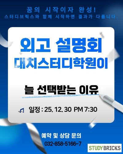 합격을 축하합니다!! 2026년 외고/국제고 합격자 설명회 안녕하세요. 대치스터디브릭스입니다. 열심히 준비한 우리 친구들의 합격을 다시한번 축하드립니다. 합격이후의 시간을 어떻게 관리하고 준비 하는지에 따라 앞으로의 학업 방향에 중요합니다. 고등학습의 수학,과학은 내신과 수능 모두에서 성패를 좌우합니다. 지금부터 체계적인 준비로 자신감과 성적을 함께 잡아드립니다. 인천외고,미추홀외고,국제고 각 학교별 공통과목,내신,수능을 한번에 관리할수 있는 대치스터디브릭스에서 수학&과학 정복하자!! ↓↓↓↓↓↓↓↓↓↓↓↓↓↓↓↓↓↓↓↓↓↓↓↓↓↓ 설명회 신청 네이버 폼 https://naver.me/xktzsZ1b <img src="https://blogthumb.pstatic.net/MjAyNTEyMjZfMTY5/MDAxNzY2NzEwMTgyNDEz.3SDO3NyBSxxlrS8dKH09nwsO3c5v6N00q_9JJ8jM7Ckg.zbrp1ftKLLgEKeKHI3ike5kNojJ4ru8YlwDsOBh6bxsg.JPEG/%BF%DC%B0%ED%BD%E6%B3%D7%C0%CF.jpg?type=s3" />