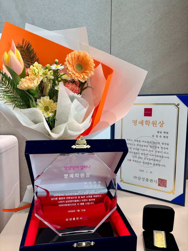 안녕하세요, 삼성영어 봉담학원 Shine 원장입니다. 저희 원은 2022년 개원이래로 2023년, 신인상 수상 2024년, 최우수상 수상 2025년, 명예학원상 수상 2026년, 올해에는 2회 연속 명예학원상 수상! 이라는 값지고 뜻깊은 결과를 얻었는대요, 명예학원상은 전국 1700여개의 삼성영어 가맹점 중 상위 1%의 명예학원으로서 우수한 학원운영과 실력있는 영어교육지도를 인정받는 원에게 수상하는 상입니다. 어떻게 봉담 영어학원이 한번도 어렵다는 명예학원상을 2회 연속 수상할수 있었을까요? 1:1 개별 맞춤 수업 봉담2지구 영어학원은 강의식 수업이 아닙니다. 우리 아이들마다 학습을 받아들이는 속도도 다르고 부족하고 필요로 하는 부분이 다....... <img src="https://blogthumb.pstatic.net/MjAyNjAyMTBfNjgg/MDAxNzcwNzA2MTA5ODg1.BDyrJWMj1-bljEG2TUQza2f4QqwhozUHm7575PZfRf8g.vKfgIqffVAQb30LEBD-GczbUtlIKlQWxzYcYiHt0GC4g.JPEG/KakaoTalk_Photo_2026-01-16-12-14-19_06_.jpeg?type=s3" />