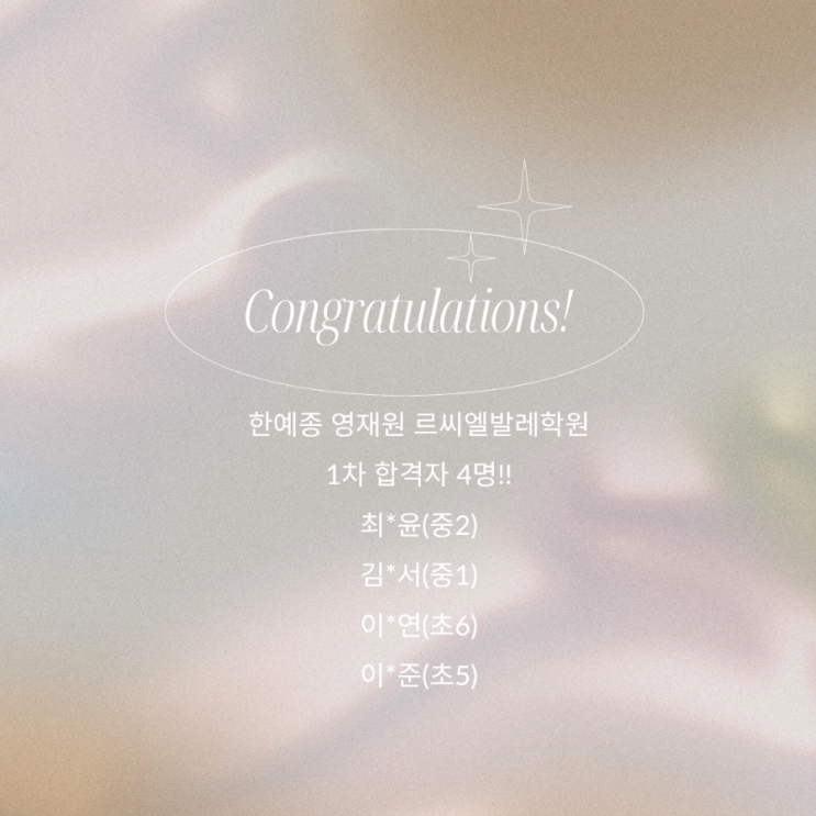 르씨엘발레학원 전공반에서 기쁜 소식을 전해드립니다 한국예술종합학교 영재교육원 1차 합격을 진심으로 축하합니다! 전공반 한예종 영재교육원 1차 합격자 4명‼️ • 최*윤 (중2) – 5년 연속 합격 • 김*서 (중1) • 이*연 (초6) – 3년 연속 합격 • 이*준 (초5) 이번 결과는 아이들이 그동안 흘린 땀과 꾸준한 노력, 그리고 무대와 연습실에서 쌓아온 시간들이 만들어낸 값진 결실입니다. 한 명 한 명 모두 너무도 자랑스럽고, 끝까지 좋은 결과로 이어질 수 있도록 르씨엘발레학원도 함께 최선을 다해 응원하겠습니다 다시 한 번 진심으로 축하합니다! <img src="https://blogthumb.pstatic.net/MjAyNjAxMjBfMTc2/MDAxNzY4ODM4MjczNzQz.NaYXj4c97JPAGlwZef9WLF1ag0pyb14FbHUU-KcKOv0g.Ggy_cdDSLAWEn3iKGPNEEXDgZMsE-gy2A-YIog-op30g.PNG/%B4%BA%C6%AE%B7%B2_%B9%CC%B4%CF%B8%D6%B8%AE%BD%BA%C6%AE_%B4%E7%C3%B7%C0%DA_%B9%DF%C7%A5_%C3%E0%C7%CF_%C0%CE%BD%BA%C5%B8%B1%D7%B7%A5_%C6%F7%BD%BA%C6%AE%A3%DF20260119%A3%DF140640%A3%DF0000.png?type=s3" />