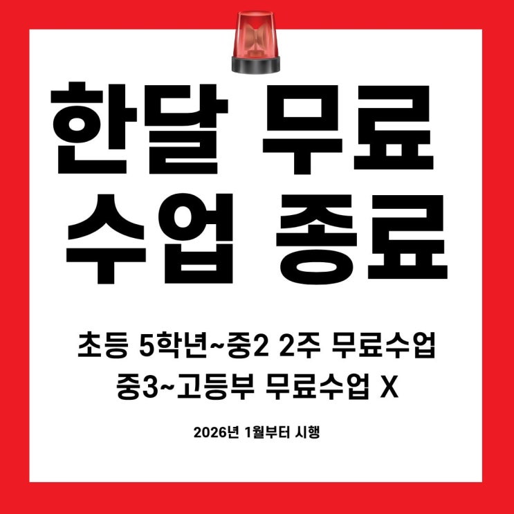 안녕하세요, 영어종결센터 동춘학원입니다. 벌써 학원을 오픈한 지 2년이 되었습니다. 그동안 한 달 무료 수업을 통해 많은 학생들이 학원을 경험해 주었고, 늘 믿고 보내주신 학부모님들께 진심으로 감사드립니다. 이에 따라 2026년 1월부터 시행될 변경 사항을 안내드립니다. ▶ 무료 수업 변경 안내 기존 : 무료 8회 수업 → 무료 4회 수업으로 변경 적용 학년: 초등 5·6학년 ~ 중2 중3 및 고등부는 무료 수업 대상에서 제외되오니 참고 부탁드립니다. 또한, 지난 2년간 학부모님들의 부담을 덜어드리고자 저렴한 수강료를 유지해 왔으나, 최근 물가 상승 및 운영 비용 증가로 인해 부득이하게 수강료 인상을 결정하게 되었습니다. 해당 사항....... <img src="https://blogthumb.pstatic.net/MjAyNTEyMThfMTIx/MDAxNzY2MDQxMTA0MDY1.nA_JO4tEzcEgNwxjihXyeH7Qjc2T4LBeRAXW10Qo6gcg.phh-lPYphp1CYfYbsOSwqKMGep52tRYMom_lxZJzp3Mg.JPEG/%C1%A6%B8%F1%C0%BB_%C0%D4%B7%C2%C7%D8%C1%D6%BC%BC%BF%E4._%284%29.jpg?type=s3" />