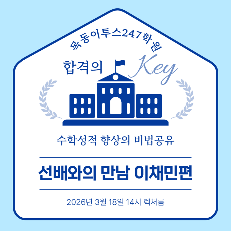 #목동이투스 #이투스247 #독학재수 #목동독학재수 #수능수학 #이투스 #스터디카페 #정승제장학금 #정승제위너스클럽 #이투스인강 #목동이투스247 #목동독학재수학원 목동이투스247학원, 수학 성적 향상의 비결을 만나다! 안녕하세요 목동이투스247학원에서 특별한 학습 이벤트가 진행되었습니다! 바로 2026년 3월 18일 오후 2시, 목동이투스247학원 렉처룸에서 열린 수학 성적을 크게 향상시킨 이채민 졸업생 간담회입니다. 이번 간담회는 단순한 경험담 공유를 넘어, 실제 성적 상승을 이뤄낸 선배의 생생한 공부법과 전략을 직접 들을 수 있는 뜻깊은 자리였습니다. 이채민 졸업생의 놀라운 성과 이번 간담회의 주인공인 이채민 졸업생은 단순....... <img src="https://blogthumb.pstatic.net/MjAyNjAzMThfMzcg/MDAxNzczODI5NDEzNjM2.48ZFqObaYgduYV6uyJq46PMAHM70y3xIkzhy2oT4OHMg.EvTYr7fsaPv9cprGSJHpqLouzmV6Ql-MF3x7iiPkXCkg.PNG/%C0%CC%C3%A4%B9%CE%BC%B3%B8%ED%C8%B8.png?type=s3" />