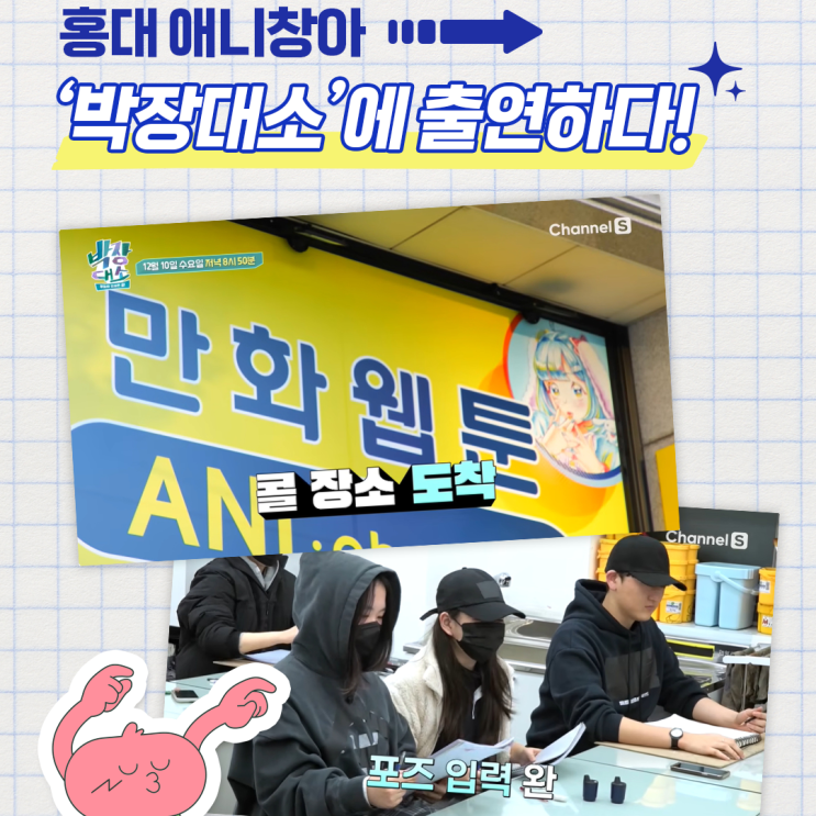 채널S <박장대소>에 홍대 애니창아가 떴다! 배우 장혁이 크로키 모델이 된 사연은? 오늘은 아주 특별하고 설레는 소식을 들고 찾아왔습니다! 연예계 대표 절친인 장혁 님과 박준형 님이 이끄는 이 화제의 프로그램에, 저희 홍대 애니창아가 등장했다는 사실! 특히 이날은 두 MC분들뿐만 아니라, 상큼 발랄한 에너지를 가진 허영지 님까지 함께 방문해 우리 학생들과 잊지 못할 추억을 만들었는데요. 스타들과 함께한 뜨거웠던 촬영 현장의 모습을 전해드립니다! ✨ 평소 화면 속에서만 보던 장혁 님이 직접 우리 학생들을 위해 일일 크로키 모델로 변신해 주셨는데요! 배우 특유의 압도적인 아우라 덕분에 크로키 수업....... <img src="https://blogthumb.pstatic.net/MjAyNTEyMjRfMTg0/MDAxNzY2NTczNjc2NDc5.G5UkTi8hThUI6EKIQirDhn2Ygk8TTmZaQhJN3zPqZ18g.XXn0XVI51R2Co8j74ucO76mA9WJJsozf58EzW1mwiHgg.PNG/1.png?type=s3" />