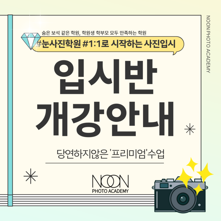 안녕하세요. 입시전문 눈 사진학원입니다. 입시는 타이밍보다, ⭐️⭐️'어떻게 준비하느냐'⭐️⭐️가 중요합니다. 눈 사진학원에서는 당연한 듯 하지만, 당연하지 않은 '프리미엄' 수업을 하고 있습니다. 학생 한 명 한 명의 실력향상을 집중으로 합격이라는 목표에 다가가는 눈 사진학원만의 차별화 된 커리큘럼입니다. ✅ 형식적인 1:1이 아닌 진짜4주 1:1 집중 기초 과정! 사진 경험이 전혀 없거나, 기초가 부족해서 입시 준비를 시작하기 두려우셨나요? 혹은 기존에 잘못된 방법으로 배워서 다시 시작해야 할지 막막하셨나요? 눈사진학원은 등록하는 모든 학생 약 4주간, 1:1로사진 촬영 기초 및 포토샵 기초과정....... <img src="https://blogthumb.pstatic.net/MjAyNjAxMDlfMyAg/MDAxNzY3OTYyMjM3NTUz.a47g-koV9p_U6va6N_j1svXVaTRAzxsbFIOTInYBP2Ug.Q9Yy30EAXiZTg3pZWO44kr9msL2uUSYc3zHVTNNuzg8g.PNG/001.png?type=s3" />