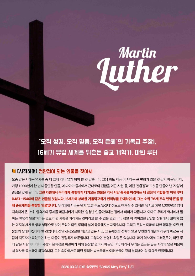 모바일로 보시는 분들은 하단으로 내려주시기 바랍니다. > 인쇄용은 상단 첨부파일을 다운로드하시기 바랍니다. > 댓글을 쓴 후, 하단 내 글 보관하기에 들어가서 보관해주세요. "SONGS Nifty Fifty for Song's Class" *학생용 글 입니다 -모바일- 2026.03.28 DYB 송오현의 ‘SONGS Nifty Fifty’ [13] “오직 성경, 오직 믿음, 오직 은혜”의 기독교 주창!, 16세기 유럽 세계를 뒤흔든 종교 개혁가, 마틴 루터 [시작하며] 전환점이 되는 인물을 찾아서 요즘 같은 시대는 역사를 좀 더 크게, 아니 넓게 봐야 할 것 같습니다. 그냥 봐도 지금 이 시대는 큰 변화가 있을 것 같기 때문입니다. 가령 1,000년에 한 번 나올....... <img src="https://blogthumb.pstatic.net/MjAyNjAzMjZfMTU2/MDAxNzc0NTMyNTU0NDI5.r1yxON4Bd9VpU5MCFIzMmVCOFa7P-AxO3mdtoscDGRsg.0rbFYFPabr-nYfsqs8hR6Nao8tZF2gVjja1c6yqe_xUg.JPEG/20260328_%B8%B6%C6%BE%B7%E7%C5%CD-%BE%D0%C3%E0%B5%CA_1.jpg?type=s3" />