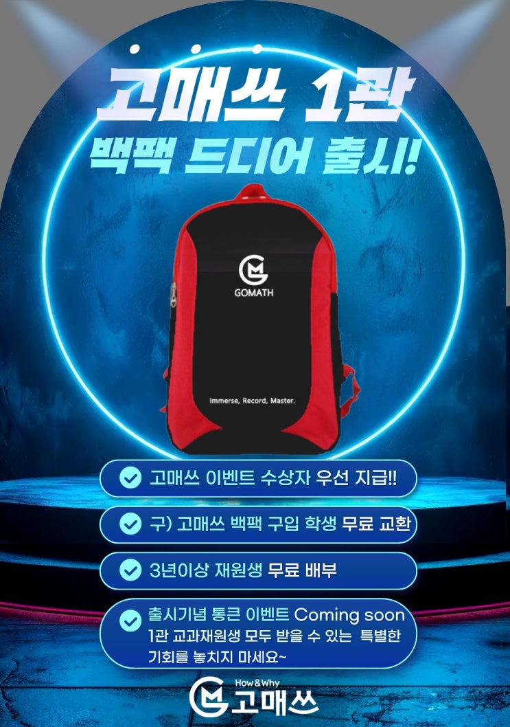 #고매쓰영재심화수학학원 #고매쓰 1관 #초등교과심화 #초등경시 #초등심화사고력 #고매쓰가방 #신상백팩 #평촌 고매쓰 재원생이벤트 고매쓰 몰입관(1관) 4월 백팩 출시!!(리뉴얼) 안녕하세요, 고매쓰영재 1관 몰입관입니다. 학부모님들께서 정말 많이 문의주셨던 "1관 전용 백팩"이 드디어 리뉴얼 출시되었습니다. 왜 1관 전용 백팩을 만들었을까요? ✔ 교재가 많은 교과 재원생들을 위한 실용성 ✔ 오래 사용할 수 있는 내구성 ✔ 교과심화/경시/심화사고력 맞춤 프리미엄 디자인 우선 지급 대상 재원생들은 학원과 함께 성장해온 학생들에게 가장 먼저 전달드립니다. ✔ 학원 이벤트 수상자 ✔ 3년 장기 재원생 그리고 기존에 학원 백....... <img src="https://blogthumb.pstatic.net/MjAyNjAzMjhfMjEg/MDAxNzc0NjY3MzcyNDg3.6hWxWHHTNi6Njgrqsp6eMZrs3-epNO3QBPan5yfyzVQg.Dn0ut2dLaGlfluTXWYsLSwaEM-KRgpcSt3DSXn9pRVAg.JPEG/1%B0%FC%B9%E9%C6%D1%C3%E2%BD%C3%BE%C8%B3%BB_%282%29.jpg?type=s3" />