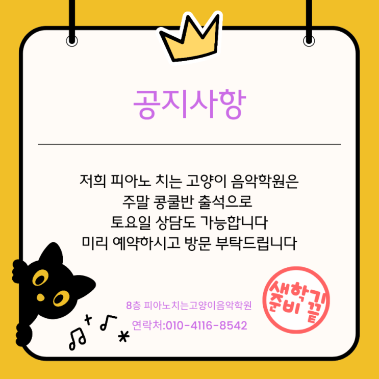 요즘 피아노치는 고양이 음악학원(부천 옥길동)에서는 콩쿨을 준비하는 아이들이 막바지 연습에 한창입니다. 토요일에도 콩쿨반 아이들이 출석하여 집중 레슨과 함께 무대에 대비한 연습을 진행하고 있으며, 저 역시 토요일마다 학원에 나와 아이들 한 명 한 명의 연주를 점검하며 마무리 단계에 필요한 디테일을 함께 다듬고 있습니다. 콩쿨반은 지금이 가장 중요한 시기입니다. 곡의 완성도뿐 아니라 집중력, 무대 매너, 연습 태도까지 전체 흐름을 정리하며 준비하고 있어요. 최근 부천·옥길동 지역 신입생 상담 문의도 늘어나 토요일에도 신입생 상담을 병행하고 있습니다. 평일 방문이 어려우신 학부모님들께 토요일 상담이 도움이 되길 바....... <img src="https://blogthumb.pstatic.net/MjAyNjAxMDVfMjYz/MDAxNzY3NTg2NDExMDI5.378mwHEuIdf1LsIT4iTGIkPRpGX1EXkC1miqzSbySpkg.ySdoMIa-Cdn7DcK86gs8vUFYepHxnB7fG_c123Mjm8Ug.PNG/900%A3%DF1767472073265.png?type=s3" />
