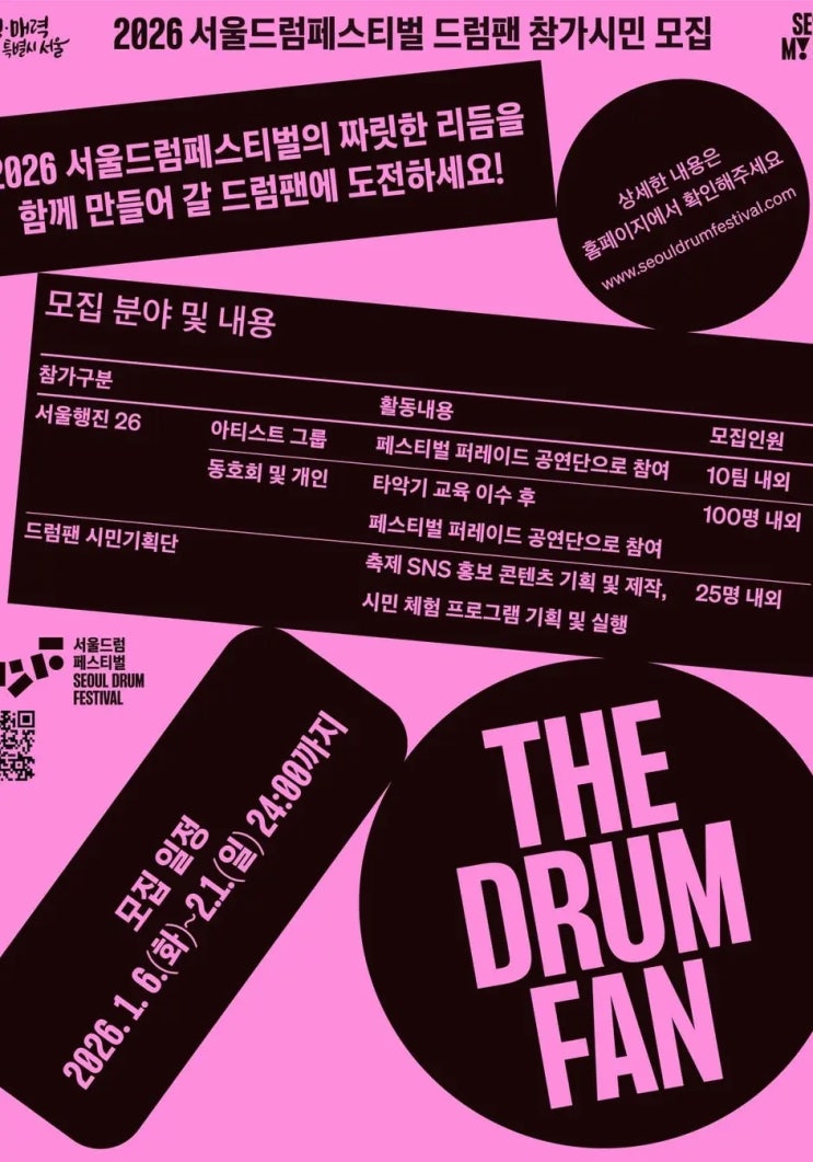2026 서울드럼페스티벌 드럼팬 참가 시민 모집 / 접수기간 : 2026.01.06(화) ~ 2026.02.01(일) 마감