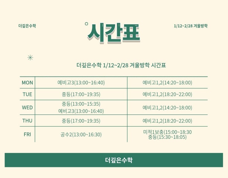 안녕하세요 일산 탄현동 중고등전문 수학학원, 더깊은수학입니다. 26년 겨울방학 시간표 공지입니다. 1/12(월)~2/28(토)까지 운영되는 시간표입니다. <더깊은수학 겨울방학 시간표> 중등부 화목- 화 5:00~7:35/ 목 5:00~7:35 수금- 수 1:00~3:35/ 금 3:30~6:05 고등부 예비고1,2 월수 2:20~6:00 예비고1,2 화목 6:20~10:00 예비고3 월수 1:00~4:40 고등부 특강 공통수학2 금 1~4:30 미적분1 금 3~6:30 학원 오픈시간 월,수,금 1:00~6:00 (금6:30) 화,목 5:00~10:00 다음학기를 위해 겨울방학부터 제대로 공부하는 것이 중요합니다. 더깊은수학은 수학을 잘하고픈 마음이 있고, 등급을 올리고 싶은 욕심도 있고, 열심히 할 태도가....... <img src="https://blogthumb.pstatic.net/MjAyNjAxMDlfMjY2/MDAxNzY3ODg2NTI1NjYw.SFemphJRLiVaGxEyLVAihq6DUP2FasfKdgC95-BSjnwg.Q66TE6A-ikm3xhqJPnyGEGyjvgO2o5PoR9oOZDRJajIg.JPEG/1767886525505.jpg?type=s3" />