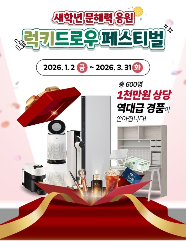 [ "새학년 럭키드로우 페스티벌"] 안녕하세요 2026년 새학년을 맞아 본사 주관 역대급 경품 이벤트인 ‘럭키드로우 페스티벌’이 오늘부터 시작되었습니다. 이번 이벤트는 본사에서 신규생과 재원생을 동시에 지원하기 위한 이벤트로, 책나무 회원들에게 기분좋은 한 해의 시작이 될 수 있도록 준비했습니다. 첫 번째, 책나무 신규 회원 대상 책나무 신규생들을 대상으로 한 럭키드로우 페스티벌!! * LG 스타일러 오브제 컬렉션 1명 * LG 코드제로 오브제 컬렉션 1명 * 다이슨 에어랩 1명 * 에스티로더 갈색병 세럼 3명 * 신세계상품권 3만원 10명 * 스타벅스 커피 284명 '26년 1월~3월 신규 등록 회원 대상이며, 기간 내....... <img src="https://blogthumb.pstatic.net/MjAyNjAxMDJfOTYg/MDAxNzY3MzU1NjAyNzE4.-az-f8AQzNrOJ-oODxFduuhvhA-SN5zNFsgF5tPNfRYg.UbiqCBqjVfxETK5_6vPjxEBQg9g_ek6K7PHO5j6sc08g.JPEG/900%A3%DF1767355601731.jpg?type=s3" />