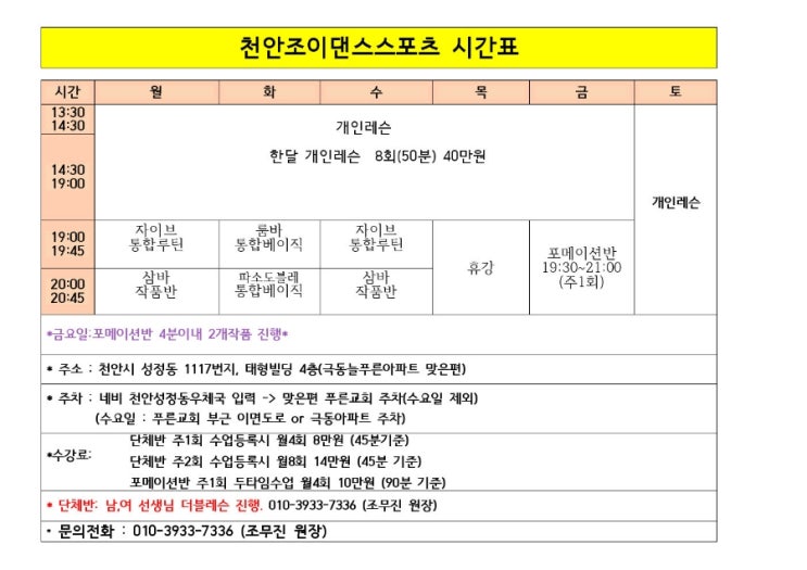 7시 자이브 초보분들도 가능하며 기본적인 동작으로 수업합니다 8시 삼바작품반 능숙하고 자연스럽게 만들수있는 반입니다 금요일포메이션반 중급 상급 모두 참여가능합니다 ☎️010 3933 7336 <img src="https://blogthumb.pstatic.net/MjAyNjAxMTFfOTcg/MDAxNzY4MTIzMzk2MzEx.6C9taa5oCDL4I4xuiAK2G0SP_XFA0uyHQbbxS8KBNf4g.UYWkDx-10I5pfV476Lj3_X4F4RksuNLPl0ungJdZggMg.JPEG/900%A3%DF1768122731071.jpg?type=s3" />
