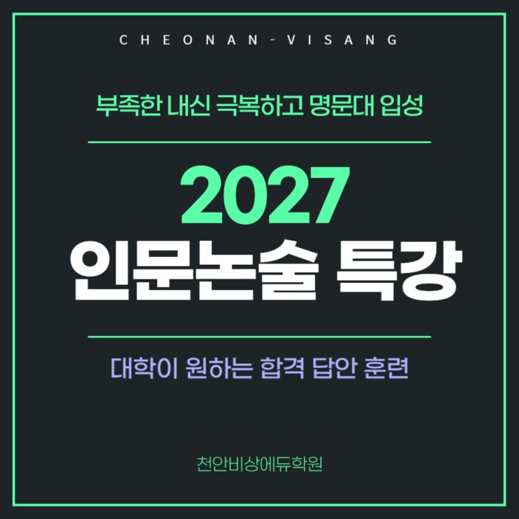 Q. 논술을 한번도 공부한 적이 없는데 합격할 수 있을까요? A. 가능합니다. 모든 학생들이 똑같은 조건이니까요. Q. 평소 글쓰기를 꽤 하는데 합격할 수 있겠죠? A. 글쓰기 실력이 타고났더라도 합격하는 것은 아닙니다. 합격하는 글쓰기의 기술이 있어야 합니다. 2027학년도 입시 대비 천안비상 인문논술반이 개설되었습니다. 논술전형은 내 성적보다 상위 대학에 갈 수 있는 전략적 선택지 중 하나입니다. 또한 내신이 좋지 않은 수험생들이 명문대학에 진학할 수 있는 유일한 기회이기도 하죠. 많은 수험생들이 논술에 관심이 있어도 제대로된 글쓰기를 배운 적이 없다보니 논술전형 도전을 남의 일처럼 보는 경향이 있는데, 사실 고등과정에....... <img src="https://blogthumb.pstatic.net/MjAyNjAxMTZfMTMw/MDAxNzY4NTI0NDQzOTY5.BCZ8Ew4qKeJdSJD6E2wVWL5Qi0kaEzx_PS5pOdZ0uqQg.0aK-KkkwKkeqP4ilu2NlltskciJsTe9Gwh3x19gtdVIg.JPEG/%C3%B5%BE%C8%B3%ED%BC%FA%C7%D0%BF%F82027%C0%CE%B9%AE%B3%ED%BC%FA%C6%AF%B0%AD%BD%E6%B3%D7%C0%CF0116.jpg?type=s3" />