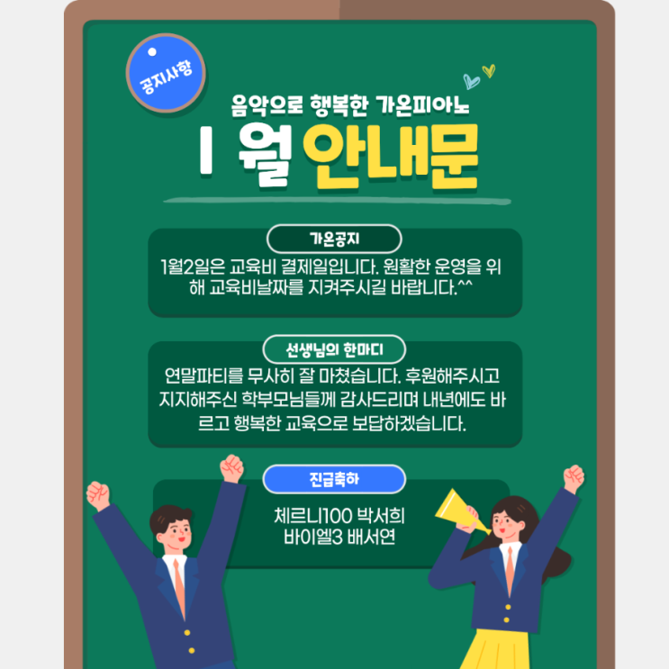 안녕하세요^^ 가득한 온기, 가온피아노입니다 가온피아노에서는 현재 유치부,초등부,중고등부,성인 시니어부를 운영하고 있어요 너무 감사하게도 대부분의 수강생들은 등록후, 기본 2년 이상을 배우고 있답니다. 매달 공지사항과 두달에 한번 영상, 수업진도 코멘트등 부모님들과 소통도 끊임없이 진행중이고요. 꼭 배워야하는곡과 아이들이 원하는곡을 함께 가르치며 수업하고 있습니다. 상계역 바로 앞이라 회사끝나고 오시기 편하고 수업을 늦은시간까지 진행하니 성인회원님들이 좋아하시더라구요^^ 아이부터 어른까지 모두가 행복한 피아노가 되길 소망합니다 이번영상은 연말이라 여행과 독감등으로 못찍은 친구들이 많았어요다음....... <img src="https://blogthumb.pstatic.net/MjAyNjAxMTNfMjg4/MDAxNzY4Mjc1NTcxNDg4.ALjFz6uCI2P3U41LdcALegv7fdn-ktnMqZMO-Y_Ko_8g.vHVccYhd7JhHNumckLpd_HXlMAkWu1j9z00j41VDFasg.PNG/900%A3%DF%C1%A6%B8%F1%C0%BB_%C0%D4%B7%C2%C7%D8%C1%D6%BC%BC%BF%E4.%A3%AD3.png?type=s3" />