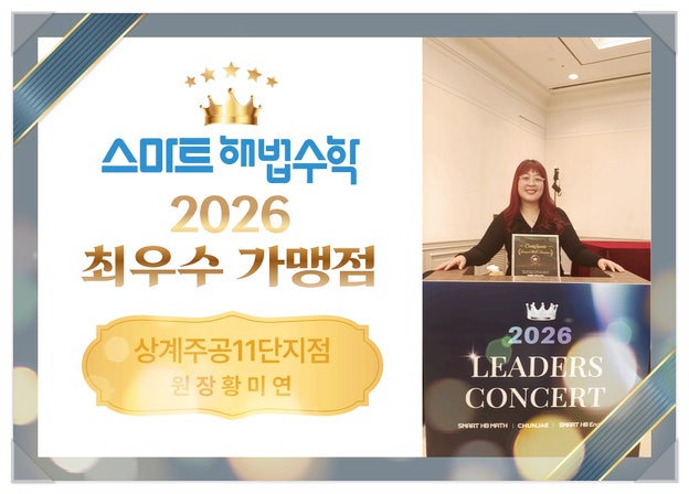 안녕하세요, 최고의 해법수학 우리해법수학논술학원입니다. 저희를 믿고 함께 해주시는 학부모님들과 학생들 덕분에 올해도 6년 연속 최우수 가맹점으로 선정되었습니다. 그리고 2025년 최고의 성과를 달성한 곳만 선정하는 "스마트 리더스"에 위촉되었습니다. 새삼 다시 한번 감사드립니다. 2026년에도 초심 잃지 않고 아이들이 즐겁게 공부할 수 있는 "우리해법"이 되도록 최선을 다하겠습니다. 그러면 아이들의 성적도, 좋은 성과도 저절로 따라올 거라고 믿습니다. #최우수가맹점 #스마트리더스 <img src="https://blogthumb.pstatic.net/MjAyNjAxMjBfMjQz/MDAxNzY4OTE1MTc0NjU4.piFmRKn-QV8Rr26H_5QsaupKFSU840d6mXhsle9s6cYg.oc_UuEElwogXNiooV5kYN3NVqrupfB1w2rHhVSZHlP0g.JPEG/KakaoTalk_20260118_115913461_01.jpg?type=s3" />