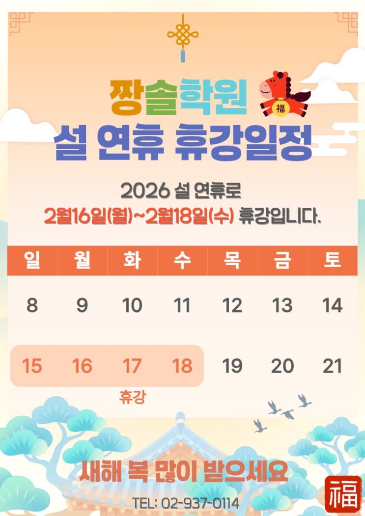 2/14(토): 정상 수업합니다. 2/16(월)~2/18(수): 학원 휴강입니다. 2/19(목): 정상 수업합니다. 수업 시간 착오 없이 아이들 등원 부탁드립니다. 새해 복 많이 받으세요! <img src="https://blogthumb.pstatic.net/MjAyNjAxMjJfNTAg/MDAxNzY5MDc4MTAzODcw.qEPtMOzlZwV7LZehweBGsWTm24z3cu1qlAOOwZEypOwg._vZ46OiTCBcR92nLyqHeiQLuFNYRhQwFTZS7vTKsprQg.JPEG/%C1%A6%B8%F1%C0%BB_%C0%D4%B7%C2%C7%D8%C1%D6%BC%BC%BF%E4._%286%29.jpg?type=s3" />