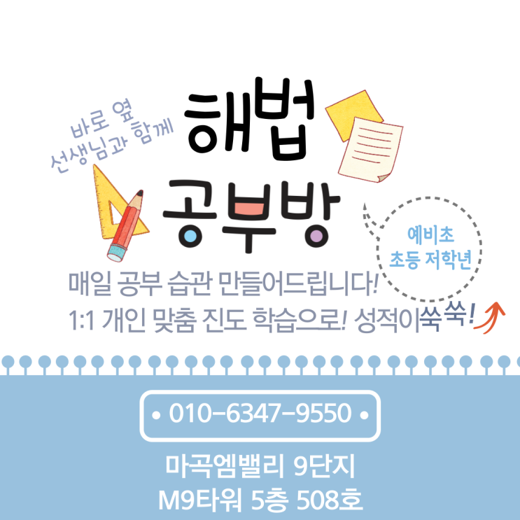 안녕하세요. 엠밸리 9단지 해법 공부방입니다. 예비초 1·2학년 모집 안내 공부의 시작, 방향이 중요합니다 초등학교 입학은 아이에게 처음으로 ‘공부’라는 개념을 만나는 시기입니다. 이 시기에 무엇을 얼마나 하느냐보다 더 중요한 것은 공부를 대하는 태도와 습관입니다. 저희 학원은 예비초 1·2학년 아이들이 공부를 부담으로 느끼지 않고 자연스럽게 익숙해질 수 있도록 돕는 것을 목표로 합니다. 예비초 저학년, 왜 따로 준비해야 할까요? 초등 저학년은 ✔ 집중 시간 ✔ 이해 속도 ✔ 학습 경험 모두 아이마다 크게 다릅니다. 이 시기에 무리한 선행이나 반복 문제 풀이보다는 아이의 속도에 맞춰 기초를 단단히 다지는 학....... <img src="https://blogthumb.pstatic.net/MjAyNjAxMTFfOTEg/MDAxNzY4MTE5NjQ4MDI4.cZr2V5q5gKSJ_1sfjjb5KuJyVQXUgAw6_7VH7ja6swkg.VA_m1BgYNpVUU9dhQzqK82Z-QzWjjcWJ-zY6MRhOL4Ag.PNG/%C7%D8%B9%FD%B0%F8%BA%CE%B9%E6.png?type=s3" />