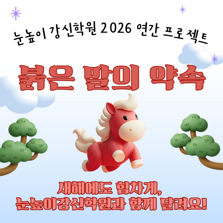 2026년 새해 계획, 모두 잘 지키고 있나요? 눈높이러닝센터 강신학원에서는 26년도 학업과 생활 습관을 다잡는 [붉은 말의 약속] 이벤트를 진행중입니다~ 과연, 어떤 이벤트일까요~?! 붉은 말의 약속 이벤트는 총 3가지 구성으로 진행됩니다! ① 새해 약속 다짐하기 새해 다짐을 친구들이 스스로 적고 1년 동안 타임캡슐에 잘 보관했다가 2026년이 끝날 때 다시 돌려받아요. 잘 지킬 수 있는 다짐을 만들고, 나중에 한 해를 돌아보기로 약속! ② 방학 100% 출석 도전! 1월 15일 ~ 2월 27일까지 100% 출석을 완성한 친구에게는 2월말 선물이 팡팡! ③ 행운이 담긴 포춘쿠키 선물 위 두 가지를 참여한 친구는 포춘쿠키를 받아서 행운의 메세지....... <img src="https://blogthumb.pstatic.net/MjAyNjAxMTZfMjg1/MDAxNzY4NTQ1MjY0NDIy.jnhkF-LGyZwh7sAX4c-UlGgU2pO5biYEuef9XDoyPAIg.RzZ8H5xmBxSoNkHS_odW5t2YCpyN4cbi09OLYorr8DYg.PNG/%BA%D3%C0%BA_%B8%BB%C0%C7_%BE%E0%BC%D3-_%BA%B9%BB%E7%BA%BB_%281%29.png?type=s3" />
