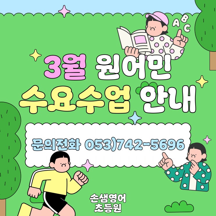 신청 기간 3/10(화) 15:00 - 3/11(수) 22:00 (기한 내 신청시에도 조기 마감될 수 있음) 신청 문의 손샘영어 초등원 053-742-5696 수강 기간 (총 2회차) ✅ 3/18 (수) 16:00-16:50 (50분) ✅ 3/25 (수) 16:00-16:50 (50분) 주의사항 선착순 조기 마감 사전 신청 필수 / 당일 신청 불가 원활한 수업 진행을 위해 지각 입실 불가 https://sonsam.co.kr/ <img src="https://blogthumb.pstatic.net/MjAyNjAzMDNfNTUg/MDAxNzcyNTIzNTQ2NzU3.-QtA9lyJw6MSlkILyHfNLjrNQv4MvlmzcadKUhVNfu0g.3tImgQocLy2ThOrzeoJqDu862Jyb1yBkMlzwlGSqx5Ug.JPEG/3%BF%F9_%BF%F8%BE%EE%B9%CE_%BC%F6%BF%E4%BC%F6%BE%F71_%BC%D5%C1%F6%B9%CE.jpg?type=s3" />