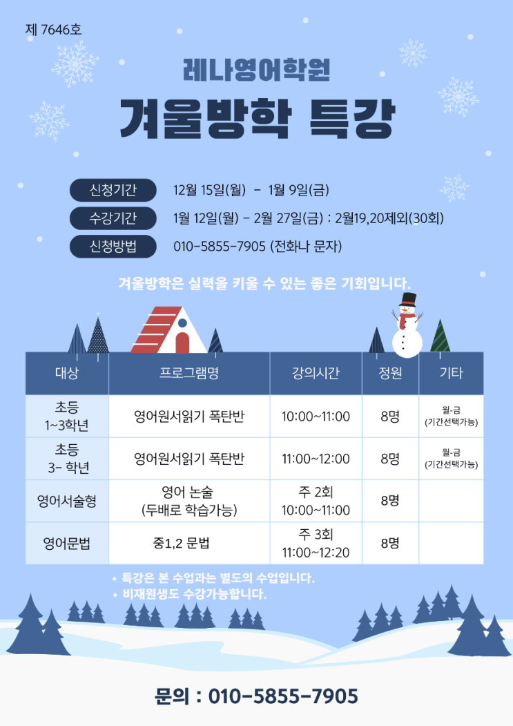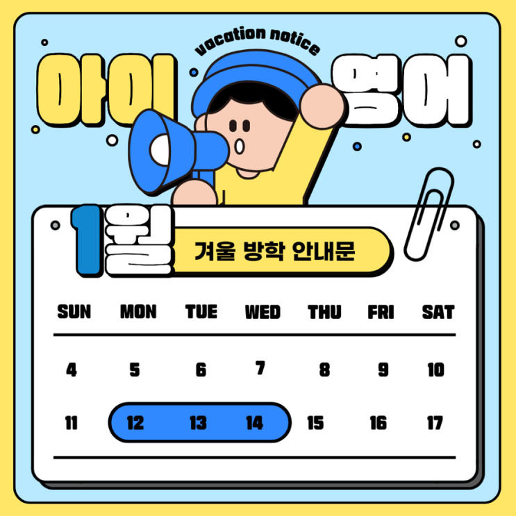 안녕하세요. 아이들의 즐거운 배움이 이어지는 아이영어 입니다. 추운 겨울 속에서도 늘 성실하게 수업에 참여해 주는 우리 아이들과 믿고 맡겨주시는 학부모님께 감사드리며, 아이영어의 겨울 방학 일정을 안내드립니다. ☃️ 겨울 방학 기간 1월 12일(월) ~ 1월 14일(수) 해당 기간에는 모든 수업이 쉬어갑니다. 아이들이 충분히 쉬면서 몸과 마음을 재충전하는 시간이 되기를 바랍니다. 방학 이후에는 더욱 알찬 수업과 에너지로 아이들을 다시 만나겠습니다. 방학 전후 수업 일정이나 궁금하신 사항은 언제든지 편하게 문의 주세요. 감사합니다. <img src="https://blogthumb.pstatic.net/MjAyNTEyMjJfNjAg/MDAxNzY2MzgyOTM0NTEy.1cMzbZSgtwyZrgSQ-dj-2lWZN366mE0FSFQFR2Q04hsg._B4cabZA2onoZdPbTKN9RNDF7XEVQvZxF422EoVtgEsg.PNG/IMG%A3%DF4470.PNG?type=s3" />