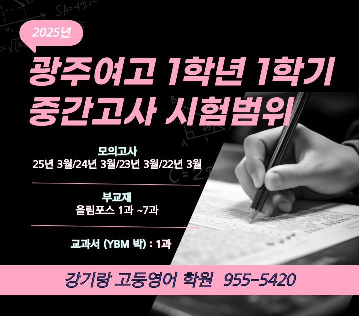 2025년 광주여고 1학년 1학기 중간고사 시험범위 모의고사 : 2025년 3월 / 2024년 3월 / 2023년 3월 / 2022년 3월 고1 전국 연합 모의고사 부교재 (EBS 올림포스) : 1과 ~ 7과 교과서(YBM박) : Lesson 1 2024년에는 모의고사랑 교과서만 나왔었는데 2025년에는 부교재 올림포스가 있네요. 3월에 부교재가 나오기 전까지 모의고사 4개년 정도(2026년 3월 ~ 2023년 3월)를 마스터하셔야 할 것 같습니다. #2025년광주여고영어시험범위 #광주여고영어내신대비학원 #광주여고근처영어학원 #강기랑고등영어학원 <img src="https://blogthumb.pstatic.net/MjAyNjAyMTRfNzkg/MDAxNzcxMDQzNjcxMjYz._BfJuhFqaQtmHlTWhN23q37fKqoCrYhY-EEMfkJbhWMg.p2hqY_rDqLghya7aCIGQd7JkHcfG4WiHjC-XS12pqjwg.JPEG/%C1%A6%B8%F1%C0%BB-%C0%D4%B7%C2%C7%D8%C1%D6%BC%BC%BF%E4_-001_%2866%29.jpg?type=s3" />