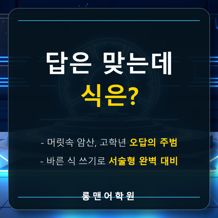 중등 수학 상위권이 고1 첫 시험에서 무너지는 진짜 이유 안녕하세요! 광주 상무지구 수학학원 유식한 유식쌤입니다. 중학교 시절 수학 성적이 좋았던 학생들도 고등학교 첫 중간고사에서 충격적인 점수를 받는 경우가 많습니다. 많은 학부모님들께서 '공부량이 부족해서'라고만 생각하시거나, '선행이 덜 되어서'라고 생각하십니다. 하지만 실상은 전혀 다르죠. 예비 고1 학생들이 ❗고등 수학의 높은 벽을 넘지 못하는 '진짜' 이유가 있습니다. 오늘은 그 이유를 상세히 말씀드리고자 합니다. 이래서 반등이 어렵다? 무리한 선행은 NO! 많은 학생들이 겨울방학 동안 고등학교 과정을 수차례 반복하며 맹목적인 &....... <img src="https://blogthumb.pstatic.net/MjAyNjAyMTJfMjIx/MDAxNzcwODg0NjU1NjY0.awe90YczK-PoQvrLFHy90RkebbTCVSRM821IOHZfIjgg.R8fvGMOTpWa1KaPbOMaTdVE8ckhwiBtrckOtcG6UaQwg.PNG/14.png?type=s3" />