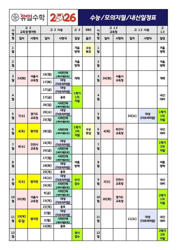 안녕하세요 #유일수학학원 입니다. 2026년도 수험생들을 위한 #수능 / #모의평가 / #내신일정표 를 정리해 공유드립니다. ( 아래 사진에서 전체 일정 확인 ) #입시 에서 가장 중요한 것은 정확한 일정 관리입니다. 시험 날짜를 기준으로 역산해 체계적인 학습 계획을 세우는 것이 합격의 시작입니다. #유일수학학원 에서는 #모의평가분석 부터 #내신대비 , #수능 마무리 전략까지 학생별 맞춤 커리큘럼으로 관리합니다. 일정표 저장해두시고, 지금부터 차근차근 준비하세요! <img src="https://blogthumb.pstatic.net/MjAyNjAyMTlfNzgg/MDAxNzcxNDg4NDQxNDYw.3QIC_mSrY2jT3FXyna96wl0WstxA30mxUzjfPmx3v3Ag.d6jhvLhdFSZeCGP9eFn1wGjgkZS4-jY6MVx41gb7TGUg.JPEG/KakaoTalk_20260219_163935924.jpg?type=s3" />