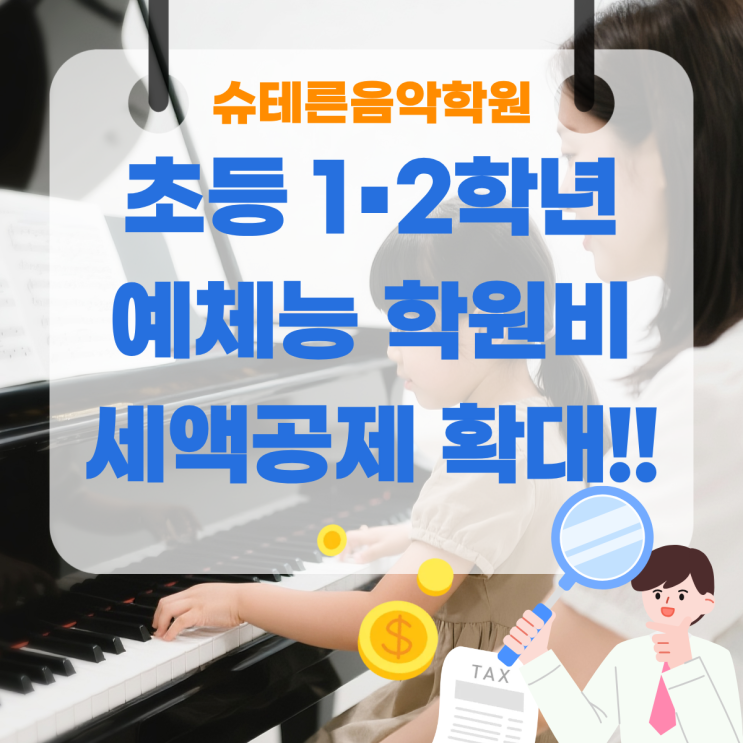요즘 학부모님들 상담하다 보면 “피아노 학원비도 연말정산에 도움이 되나요?” 이 질문 정말 많이 받아요. 결론부터 말씀드리면, 2026년 연말정산부터는 ‘된다’ 쪽으로 크게 바뀝니다. ✅ 초등 1·2학년 예체능 학원비 공제 확대 그동안 교육비 세액공제는 ✔ 유치원(취학 전)까지만 가능했는데요, 이제 초등학교 1·2학년 아이들까지 확대됩니다. 특히 학부모님들이 많이 궁금해하시는 ✔ 피아노 ✔ 음악학원 ✔ 미술, 태권도, 수영 등 ‘예체능 학원비’가 공제 대상에 포함됐어요. 음악학원비도 해당될까요? 네, 해당됩니다. 초등 1·2학년 아이가 ✔ 예체능 목적의 음악 수업(피아노 등)을 받고 있다면 교육비 세액공제....... <img src="https://blogthumb.pstatic.net/MjAyNjAxMTNfMTAz/MDAxNzY4MzA2NTgzMDI0.pBd3qShXeTJtUXbfthgYw3fRKucOeYxL_AFA5QOg15sg.KshSJmNrGyg0CF3zR5HVdzrTIb6lY_N3Lhy-hzDwgkog.PNG/1.png?type=s3" />