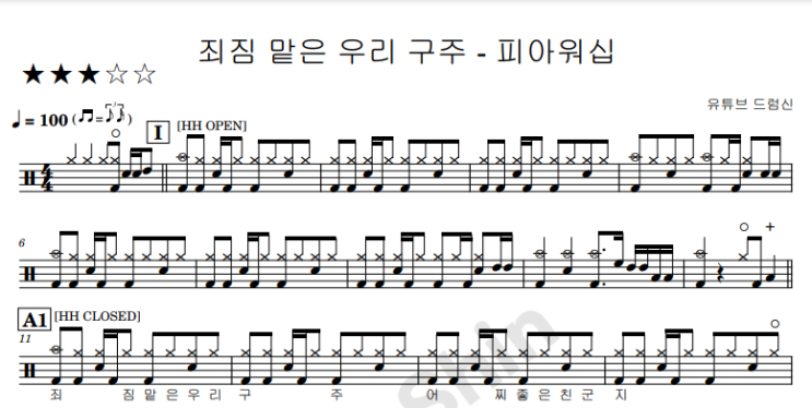 안녕하세요^^ 광주 최고의 시설 & 실용음악 전문학원 "블루실용음악학원" 입니다. "5"만 유튜버 "드럼신"원장님이 언제나 최고의 드럼실력으로 여러분과 함께 합니다 오늘 올려드릴 영상과 악보는 ' 피아워십 ' 의 "죄짐 맡은 우리 구주" 입니다 체계적인 노하우로 드럼 연주에 도움이 될 수있게 직접 정성껏 만들었습니다 드럼반주자 분들께 많은 도움이 되시기를 바랍니당^^ 즐겁게 감상해주셔요^^ 악보 구매 사이트 드럼 & 악기 & 보컬 레슨문의 네이버 톡톡 : 블루실용음악학원 카카오톡 : 블루실용음악학원 인스타그램 : @bluemusic_academy 디엠은 언제나 환영해요^^ 감사....... <img src="https://blogthumb.pstatic.net/MjAyNjAxMjJfMjcw/MDAxNzY5MDYwMzE4NDg0.RIO4olmitXc-_6NdKLsP1VeBgFTns2n0t3-CXr-cuiEg.sNf4WsgtHf_6JP1n79Mtvvn3EXJ3LKU4Sm6bZQF0KYwg.PNG/%C1%CB%C1%FC_%B8%C3%C0%BA_%BF%EC%B8%AE_%B1%B8%C1%D6_%BA%ED%B7%CE%B1%D7.png?type=s3" />