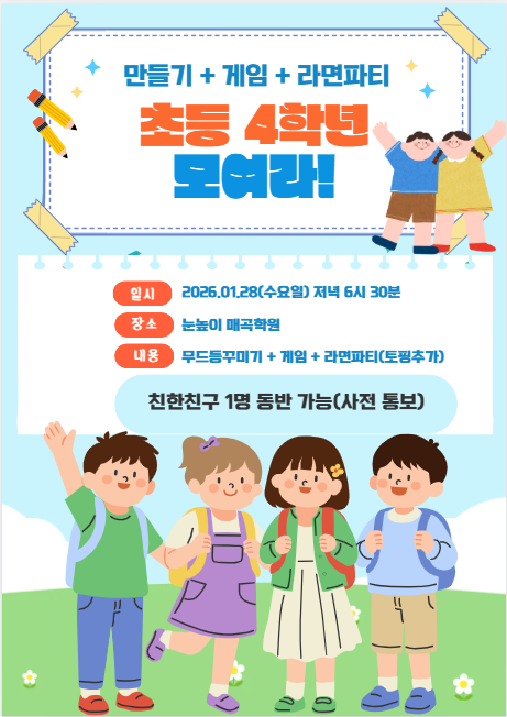 매곡학원에서 초등 4학년 친구들을 위한 특별한 겨울 추억 이벤트를 준비했어요 만들기 활동부터 신나는 게임 그리고 모두가 좋아하는 라면파티까지! 공부에서 잠시 벗어나 친구들과 웃고 즐기며 추억을 쌓는 시간입니다. ✔ 일시 : 2026년 1월 28일(수) 저녁 6시 30분 ✔ 장소 : 눈높이 매곡학원 ✔ 내용 : 무드등 만들기 + 게임 + 라면파티(토핑추가) ✔ 특별사항 : 친한 친구 1명 동반 가능 (사전 통보 필수) 눈높이 매곡학원에 다니는 초등 4학년 친구라면 누구나 참여 가능! 재미와 추억, 두 마리 토끼를 잡을 수 있는 이번 행사에 많은 참여 바랍니다 <img src="https://blogthumb.pstatic.net/MjAyNjAxMjNfMjU0/MDAxNzY5MTQ2MTcwMTM4.mfQJxsPHRPpKOo3uIw8v8sXT8H84ORKvbbPdJc6Ylx0g.FR6fK7ppXuG2tPjnsnUcG6beQ5hD-F3wYgiV8ixqcSEg.PNG/image.png?type=s3" />