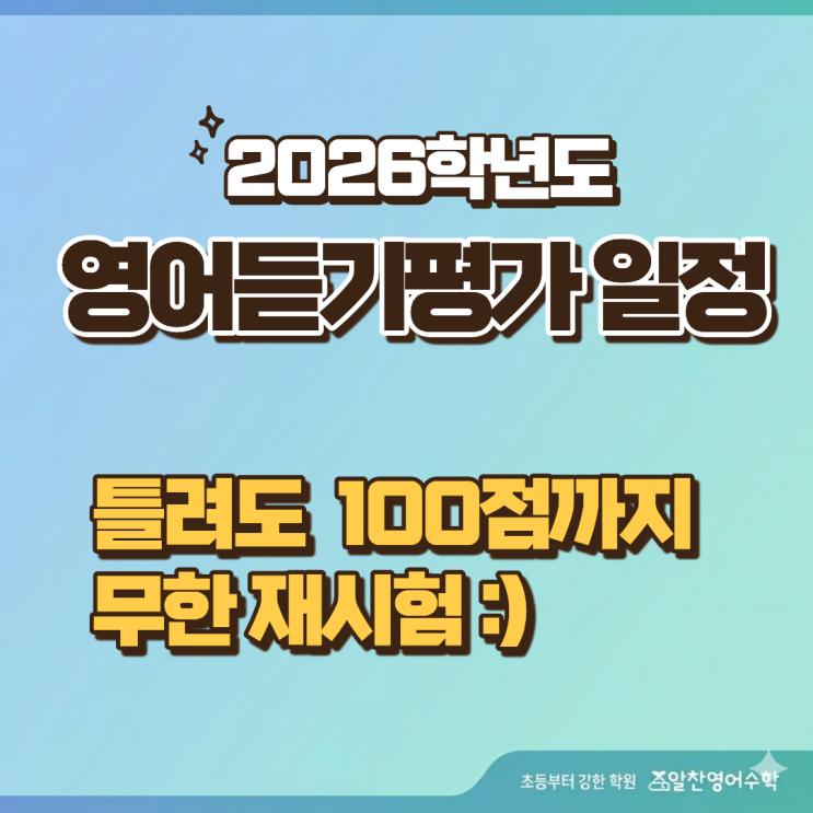 새 학기가 시작되자마자 우리 학생들이 챙겨야 할 중요한 일정이 있죠? 바로 전국 단위로 실시되는 '2026학년도 중등 영어듣기평가'예요. 올해는 언제 치러지는지~ 그리고 어떻게 대비해야 할지~ 알찬 영어원장이 깔끔하게 정리해 드려요^^ 2026학년도 중등 영어듣기평가 일정 < 1학기 중등 영어듣기평가 > 3월 31일(화): 1학년 4월 1일(수): 2학년 4월 2일(목): 3학년 < 2학기 중등 영어듣기평가 > 9월 1일(화): 1학년 9월 2일(수): 2학년 9월 3일(목): 3학년 듣기평가는 내신 성적에 수행평가로 반영되기도 하고, 멀리는 수능 1등급의 베이스가 되므로 절대 가볍게 넘겨서는 안 된답니다! 그렇다면, 듣기 공부 어떻게 해....... <img src="https://blogthumb.pstatic.net/MjAyNjAzMDhfMjAg/MDAxNzcyOTgwMTI3MDY4.X0Br_WIYSMnHly1bQ6RFPhcSVePCAngQuFVWQB5JEM0g.Os1vgZE2APHYUH4mi4G2OTUuihqkQs2B7HmKInTiMSYg.PNG/%C3%D6%C1%BE.png?type=s3" />