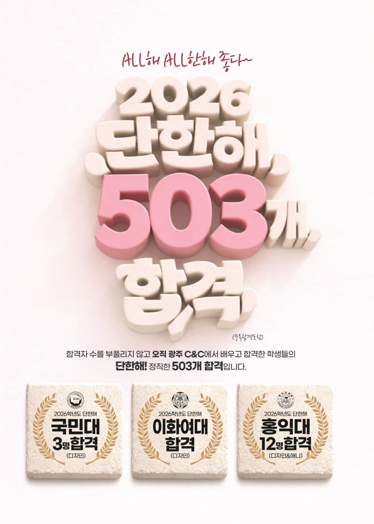 안녕하세요 오늘은 광주 입시 미술학원 광주 본원 수완 C&C미술학원엣 2026학년도 미대 입시 합격 소식을 전해드립니다~! 이번 입시에서도 좋은 결과가 이어졌는데요! 광주미술학원 광주 C&C미술학원에서 2026년 미대입시에서 총 503개의 합격 성과를 기록하며 많은 학생들이 목표로 하던 대학 진학에 성공했습니다! 오직 광주 C&C미술학원의 합격자입니다! 미술입시는 단순히 그림 실력만으로 결과가 결정되는것이 아닙니다~! 대학별 실기 유형에 대한 정확한 분석, 학생들에게 맞는 체계적인 수업 진행 그리고 꾸준한 피드백과 관리가 함께 이루어져야 좋은 결과로 이어질수 있습니다! 광주 C&C미술학원은 이러한 부분을 중심....... <img src="https://blogthumb.pstatic.net/MjAyNjAzMTJfNzcg/MDAxNzczMjk2NDU2MDM0.xQvudRF86WfVkicum9s9urCr497QUOh4QNKCXNxuk-og.5ghScupFosItZZMvNpacKC6oMx1780D_7Xrd7elo2N0g.JPEG/KakaoTalk_20260310_142605597_01.jpg?type=s3" />