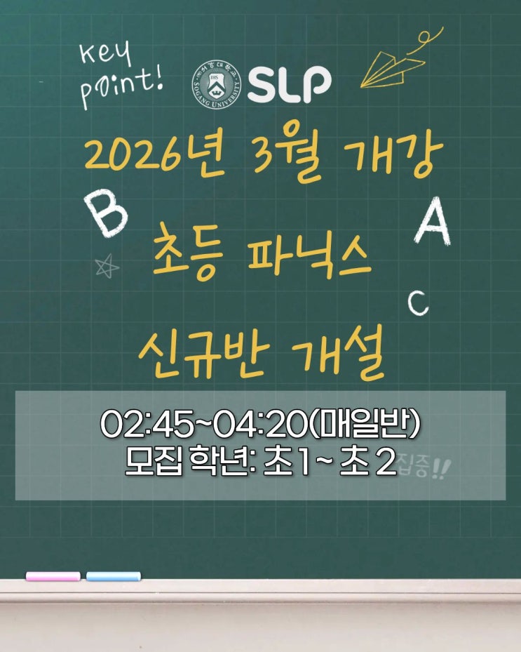 2026년 3월 개강 | SLP 초등 파닉스 신규반 안내 초등 영어 학습의 시작 파닉스! 기초 단계에서 얼마나 체계적으로 소리와 문자를 연결하느냐에 따라 이후 리딩·라이팅·스피킹 전반의 속도와 완성도가 달라집니다. SLP 초등 파닉스 과정은 30년 동안 검증된 SLP 커리큘럼을 바탕으로, 초등 저학년에게 꼭 필요한 읽기 기초를 안정적으로 구축하는 데 목적이 있습니다. ▪ 수업 안내 개강: 2026년 3월 수업 시간: 02:45 ~ 04:10 (매일반) 모집 학년: 초등 1학년 ~ 2학년 ▪ 수업 특징 SLP 초등 파닉스 수업은 파닉스를 단순 암기 위주로 지도하지 않습니다. 소리 → 문자 → 단어 → 문장으로 이어지는 자연스러운 읽기 흐름을 중심으로 수업을 설....... <img src="https://blogthumb.pstatic.net/MjAyNjAxMTNfMTY2/MDAxNzY4MjgzNTMzODg1.tDESFXbP36N7U-I4RWu3AReBneows5z1JQAokumWtxkg.BSYMVswhZbc2NDpgHhhfxVCfqs6HqT8TtM9VR0UHEwgg.JPEG/KakaoTalk_20260113_145126140.jpg?type=s3" />