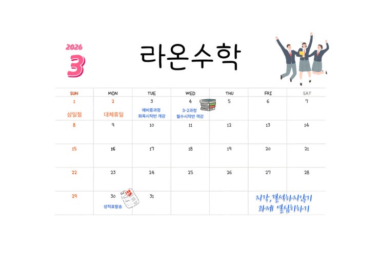 3월, 새로운 시작의 문이 열렸습니다. 설렘과 긴장이 함께하는 개학이지만, 여러분의 한 걸음 한 걸음이 분명 큰 성장을 만들어 낼 것입니다. 올해는 "조금 더 깊게 생각하는 힘", "끝까지 해내는 힘"을 키우는 한 해로 만들어 봅시다 라온수학도 여러분과 함께 최선을 다해 뛰겠습니다. 2026년 3월, 우리 함께 멋지게 시작해 봅시다 지금 잘하는 것도 중요하지만 앞으로 더 잘 할 수 있는 힘을 키우는데 집중하겠습니다. 늘 함께 고민하며 성장하는 라온이 되겠습니다. <img src="https://blogthumb.pstatic.net/MjAyNjAyMjhfMjk4/MDAxNzcyMjg1MjM2NTI1.2NYa2h4FoqQXMuX_HAF9xP7Y1DnAMr3t-MJuNylV2Qsg.e_kBI-mVHQOWZDLJDhX57ZPD4Uoweyybe_fXNjMQT_sg.JPEG/3%BF%F9%C0%CF%C1%A4%BF%CF%BC%BA.jpg?type=s3" />