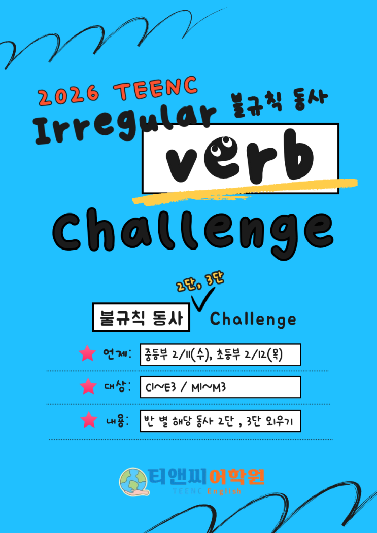 안녕하세요! TEENC 어학원입니다. 티앤씨 친구들이 기다리던 연간 이벤트! ♥ 동사 3단 Challenge ♥ 가 2월에 찾아옵니다! 각 클래스별로 준비된 동사 리스트 50개 또는 100개에 도전하는 챌린지로, 외우고! 말하고! 자신감까지 쑥쑥 키우는 시간이에요 목표를 세우고 끝까지 도전하며 성취감 UP! 영어 실력 UP! 자신감 UP! 점수대별로 선물도 준비되어 있으니 아이들이 즐겁게 참여할 수 있도록 많은 기대 부탁드립니다 <img src="https://blogthumb.pstatic.net/MjAyNjAxMzBfMjgg/MDAxNzY5NzUyMzM3NzE0.3YzKOZLUiY2yqrN86onkfpo1iZLMJ8OXccWiVvoVzNIg.wgOaNko0IflkXAboNdL7TnWmfY98bn1kX8G_6xcpZ-Ig.PNG/%C1%A6%B8%F1%C0%BB_%C0%D4%B7%C2%C7%D8%C1%D6%BC%BC%BF%E4._%285%29.png?type=s3" />