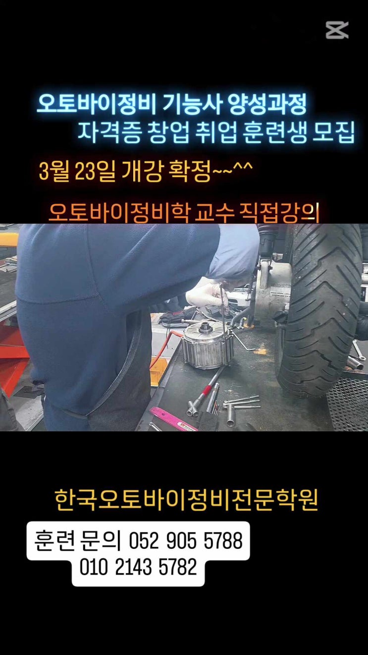 2026년 3월 23일개강 훈련생 모집공고 2026년도 국비지원과정 오토바이정비사 양성과정 훈련생을 모집합니다. www.hrd.go.kr 고용24를통하여 지원이 가능하며, "한국오토바이정비전문학원"을 검색하시면 저희 과정이 검색되어 지원하실 수 있습니다 3인1개조로 편성하여 다양한 교보재를 통한 실습중심의 훈련이 가능합니다. 듣고 보는것과 직접 경험하는것은 차원이 다릅니다. 훈련일정은 2026년 3월 23일부터 2026년 5월14일까지며, 오전 10시부터 오후 6시까지 총 240시간 과정입니다. 더 자세한 문의사항은 한국오토바이정비전문학원 052-905-5788번 혹은 010-2143-5782번으로 문의주시면 최대한상세하게안내해드리겠습니다. 감사....... <img src="https://phinf.pstatic.net/image.nmv/blog_2026_01_29_2794/F8pIm5US7J_03.jpg?type=f480x480" />
