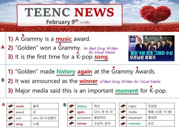 안녕하세요 울산 동구 화정동 힐스 상가 앞에 위치한 초, 중등 영어학원 TEENC 어학원입니다. 이번주 우리 친구들과 이야기 나눈 T-News 소개해드립니다. 2025년 넷플릭스 애니메이션 영화 'Kpop Demon Hunters' 수록된 곡인 Golden 'Golden'은 1일(현지시간) 오후 미국 로스앤젤레스(LA)에서 열린 제68회 그래미 어워즈 사전 행사에서 Best Song Written For Visual Media 부문(곡을 쓴 작사, 작곡가들에게 주어지는 상) 수상작으로 발표 되었습니다. K팝 작곡가 혹은 음악 프로듀서가 그래미 어워즈를 수상한 것은 이번이 처음입니다. <img src="https://blogthumb.pstatic.net/MjAyNjAyMTBfMjU2/MDAxNzcwNzAwMTIzMzcx.leQ6uosbqyvZoHQpThTWoamObbbnjoG7JkYOlqRobxkg.vrfufpHibLae3XcWb7P7Imtmt6ivtU_Mm2oPQ9oCMaUg.JPEG/TEENC_NEWS_-_26_Feb_9th.jpg?type=s3" />
