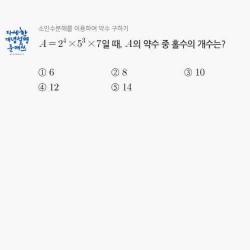 중1수학 소인수분해 단원, 소인수분해를 이용하여 약수의 개수를 구하는 유형의 심화문제입니다. 약수 중 홀수의 개수를 구할 때, 짝수와 홀수의 곱셈 규칙을 찾아내고 약수는 각각의 소인수가 몇 번씩 포함 되었는지의 결과라는 개념의 명확한 이해를 통해 문제를 해결하는 과정을 학습할 수 있습니다. 풀이 방법은 아래 영상에서 만나볼 수 있습니다. 개념설명은 관련 유튜브 영상을 참고하세요 #중1수학 #중학교수학 #소인수분해 #약수구하기 #홀수인약수 #응용문제 #심화문제 #중간고사 #내신대비 #준매쓰 #자세한개념설명준매쓰 <img src="https://blogthumb.pstatic.net/MjAyNjAxMTNfMjgz/MDAxNzY4Mjg1MDE0MjI1.9hPex5FrIT3M1hJeFfbZyxqzn8r8vWxCmI7fCoOsrCog.29_30Y6tmjL9UHW0yD4tsRFzjUdlb5nFbvN4j53affAg.PNG/%C0%C0%BF%EB%BD%C9%C8%AD%C0%AF%C7%FC_%BA%ED%B7%CE%B1%D7_%C0%CC%B9%CC%C1%F6%28%BC%D2%C0%CE%BC%F6%BA%D0%C7%D8%B8%A6_%C0%CC%BF%EB%C7%CF%BF%A9_%BE%E0%BC%F6_%B1%B8%C7%CF%B1%E2%29.png?type=s3" />