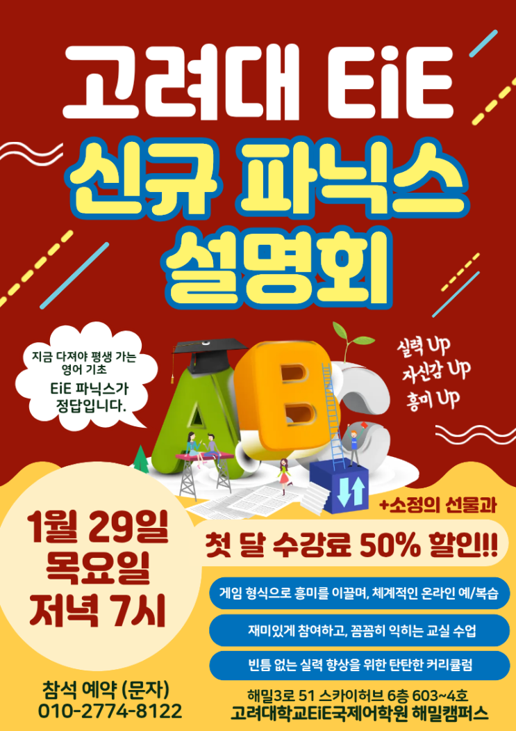 안녕하세요. 고려대EiE국제어학원 해밀캠퍼스입니다. 26년 3월에 새롭게 오픈하는 신규 파닉스반 원생 모집을 위해 설명회를 개최합니다. 꼭 참석하셔서 우리 아이의 영어학습 관리에 대한 효율적인 팁과 탄탄한 파닉스 커리큘럼에 대한 정보를 얻어가시길 바랍니다^^ 참석하신 분들께 소정의 선물과, 등록시 첫 달 수강료 50% 할인 혜택을 드리겠습니다. 많은 관심 부탁드립니다. 날짜는 1월 29일 목요일 저녁 7시입니다. 위치는 해밀동 스카이허브 (뜨레쥬르 건물) 6층 603~4호입니다. 010-2774-8122로 참석 예약 문자 부탁 드립니다. (문자 전송시 학생 이름과 학교, 학년 기재 부탁 드립니다.) <img src="https://blogthumb.pstatic.net/MjAyNjAxMTNfNSAg/MDAxNzY4MzEzMjQ5MzI0.w0iF1OEEMB59btvq6SK-x8gZp6pgnP_pw2k29JLDjogg.uNscuz6K45n2muOpUBcFGf7aoLrlrxJh-e1Fyy4Pql4g.PNG/%C6%C4%B4%D0%BD%BA_%BC%B3%B8%ED%C8%B8_%BE%C8%B3%BB%B9%AE.png?type=s3" />
