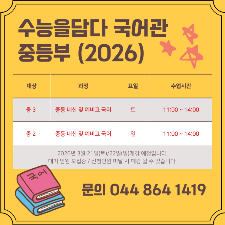 안녕하세요 수능을담다학원입니다. 중등부 개강 소식 알려드립니다 예비고(중3) 국어 중3 국어 교재 이미지 중2 국어 중2 국어 교재 이미지 참고하시면 좋은 https://blog.naver.com/gksrkd247/224215704228 https://blog.naver.com/gksrkd247/223978557838 <img src="https://blogthumb.pstatic.net/MjAyNjAzMTNfMjk3/MDAxNzczNDA4NzM4NzAy.KMFhy-UYRflV0fsK58sA7GojZGvF44_W6RmuD4eeWW0g.OfWm80GeBakaaW2AJJ7xom55BqhS1Jswa6ipj59Wa4Mg.PNG/2026_국어_중등부_시간표.png?type=s3" />