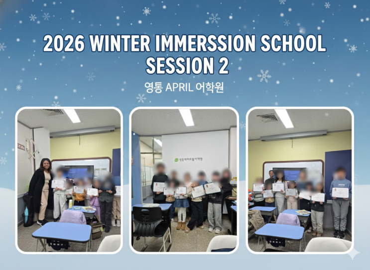 겨울방학 동안 이어졌던 영통 April 어학원 Immersion School 특강이 오늘 2차 일정까지 모두 마무리되었습니다. 1차에 이어 2차까지, 매일 아침 교실 문을 열고 들어오던 아이들의 발걸음은 점점 더 가벼워졌고, 표정은 점점 더 밝아졌습니다. 처음에는 영어 문장 하나에도 머뭇거리던 아이들이 이제는 자연스럽게 생각을 이어가고, 친구의 말을 듣고 자신의 의견을 덧붙이는 모습까지 보여주었습니다. 단순한 학습 시간이 아니라 아이들이 스스로를 믿기 시작한 시간이었습니다. 이머전 2차, 실력을 넘어 '태도'가 자라나다 이번 특강이 남긴 가장 큰 선물은 단순한 영어 실력 향상이 아니었습니다. 스스로를 믿는 마음: 처음에....... <img src="https://blogthumb.pstatic.net/MjAyNjAyMTNfMTU0/MDAxNzcwOTgwMjQ3NjYw.zWrilY-JRTd3XKNf2245EeaKDmzrC1TJZgubpMz3Zm8g.mR7_S7annjanF7BdKbPeQabfp9uAW8DesGTgA6cjiNYg.PNG/Gemini_Generated_Image_o7fkqco7fkqco7fk_%281%29.png?type=s3" />