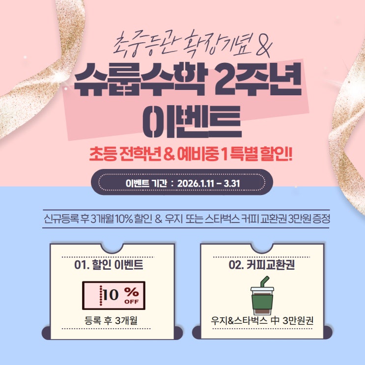24년 1월 11일 시작한 슈룹수학이 오늘 2주년이 되었습니다~!! 또한 중,고등부로 시작했는데 초등부의 여러 문의에도 수업을 다 할 수 없어 고심하다 옆으로 더욱 확장하며 새로운 교실, 새로운 선생님들과 체계적인 초등부 교육을 시작합니다!! 2주년 기념과 확장 기념으로 초등부와 예비중 1 신규 학생들을 대상으로 이벤트를 준비하였습니다. 초등부 문제 해결력 기르기 반, 심화교재 완성 반등 다양한 반을 마련하여 함께 열심히 공부할 예비 초4~예비 초 6학생들과 중학교 수업을 탄탄하게 잘 다져나갈 예비중 1 학생들은 이벤트 기간동안 얼른 얼른~ 문의 주세요!! 초등 수업은 매일 피드백 문자 / 중등 수업은 매주 테스트 후 피드백 문자....... <img src="https://blogthumb.pstatic.net/MjAyNjAxMTFfMjQy/MDAxNzY4MTIxMzgzNTE5.izOr9zOw7inqbHrPCpZc2W3vtpuvx_we7g6jelkJ1rcg.S-NbJzU-yTvScjY83c2fYCUoWxL6oc7SJtOcv-s07hQg.JPEG/%BD%B4%B7%EC%BC%F6%C7%D0_2%C1%D6%B3%E2_%C0%CC%BA%A5%C6%AE.jpg?type=s3" />