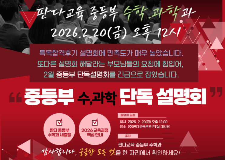 특목 합격후기 설명회 성원에 힘입어 단독 개최! 안녕하세요! 2026.2월 11일 오전 11시 특목고 합격후기 설명회 이후, 당일 학부모님들의 급박한 재요청으로 성사된 '긴급 설명회' 판다설명회의 고급정보 너무 좋으시다며, 판다교육 중등부 수학과의 또 다른 정보 설명회를 많은 부모님들이 현장에서 당일 추가 요청하셨습니다. 탄탄한 연사와 커리큘럼과 시스템이 있는 판다교육의 믿을만한 설명회! 다시한번 강력하고 임팩트 있는 내용으로 2차 중등부 단독설명회를 신이나게 개최합니다. 설명회 요청에 감사드립니다. 2월 중등부 수.과학 설명회(2/20 12시) URL : 온라인 예약지 [아래 클릭!] https://buly.kr/ChojRSu 판다 중등 수....... <img src="https://blogthumb.pstatic.net/MjAyNjAyMTFfNjQg/MDAxNzcwNzg5NjU1NjQ1.wVTRGnzDFlRqr6ZVGt1haeNMbJ8TvogHStnJ3cYP3g8g.CuOepk7sthQRwUseBxswdwy3Yr9a1PJmEHttNDZR4bwg.PNG/image.png?type=s3" />