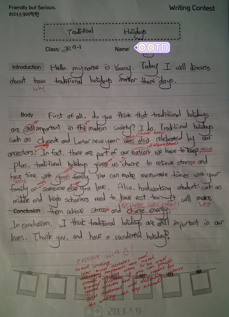 At Leaders9 Language Institute, a writing contest is held every three months. Students write essays based on a given topic. They receive editing and feedback from native English teachers, and outstanding students receive awards and gifts. Writing skills naturally improve as vocabulary and grammar build up over time. Balanced English learning with native and bilingual teachers — Leaders9. <img src="https://blogthumb.pstatic.net/MjAyNjAyMTNfNDUg/MDAxNzcwOTYxMjI5Njgy.jtdR5l45a7ceaN66QZPPdlT9gaeD1PAO1k0wwZersykg.f8-eQDTFi0g3c7nVNONmAPsmONMSbFQmukzJha5IAB8g.JPEG/KakaoTalk_20260213_143435456_04.jpg?type=s3" />